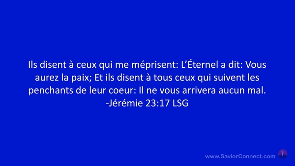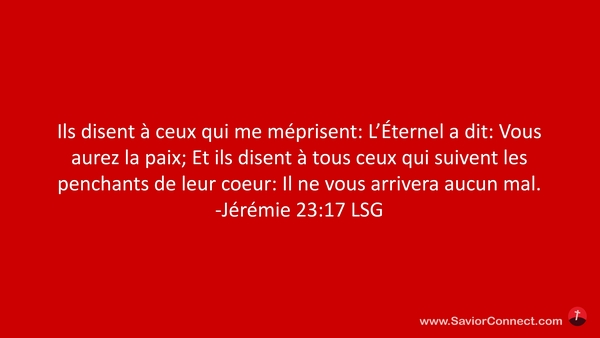 Ils disent à ceux qui me méprisent: L'Éternel a dit: Vous aurez la paix; Et ils disent à tous ceux qui suivent les penchants de leur coeur: Il ne vous arrivera aucun mal. -Jérémie 23:17 LSG