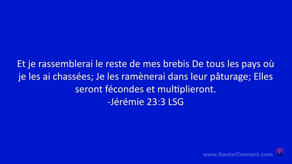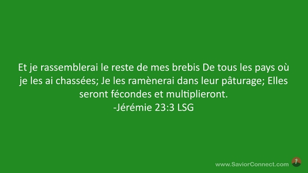 Et je rassemblerai le reste de mes brebis De tous les pays où je les ai chassées; Je les ramènerai dans leur pâturage; Elles seront fécondes et multiplieront. -Jérémie 23:3 LSG