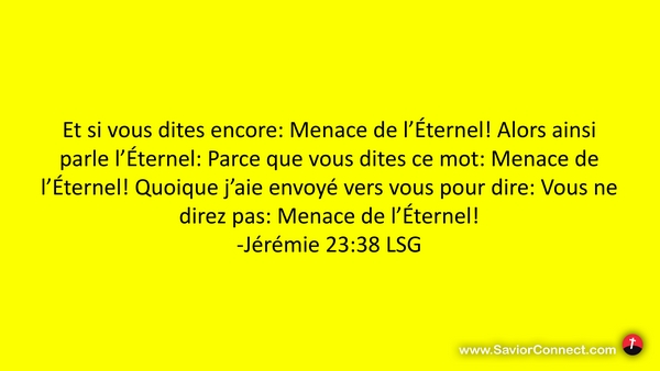 Et si vous dites encore: Menace de l'Éternel! Alors ainsi parle l'Éternel: Parce que vous dites ce mot: Menace de l'Éternel! Quoique j'aie envoyé vers vous pour dire: Vous ne direz pas: Menace de l'Éternel! -Jérémie 23:38 LSG