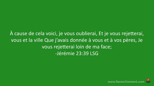À cause de cela voici, je vous oublierai, Et je vous rejetterai, vous et la ville Que j'avais donnée à vous et à vos pères, Je vous rejetterai loin de ma face; -Jérémie 23:39 LSG