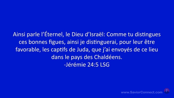 Ainsi parle l'Éternel, le Dieu d'Israël: Comme tu distingues ces bonnes figues, ainsi je distinguerai, pour leur être favorable, les captifs de Juda, que j'ai envoyés de ce lieu dans le pays des Chaldéens. -Jérémie 24:5 LSG