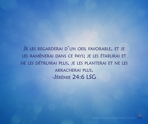Je les regarderai d'un oeil favorable, et je les ramènerai dans ce pays; je les établirai et ne les détruirai plus, je les planterai et ne les arracherai plus. -Jérémie 24:6 LSG