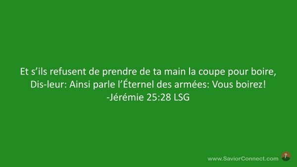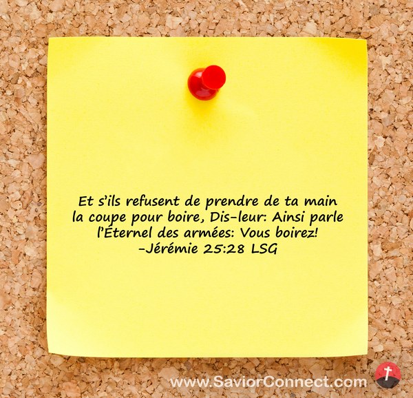 Et s'ils refusent de prendre de ta main la coupe pour boire, Dis-leur: Ainsi parle l'Éternel des armées: Vous boirez! -Jérémie 25:28 LSG