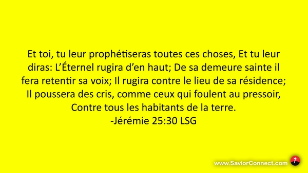 Et toi, tu leur prophétiseras toutes ces choses, Et tu leur diras: L'Éternel rugira d'en haut; De sa demeure sainte il fera retentir sa voix; Il rugira contre le lieu de sa résidence; Il poussera des cris, comme ceux qui foulent au pressoir, Contre tous les habitants de la terre. -Jérémie 25:30 LSG