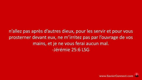 n'allez pas après d'autres dieux, pour les servir et pour vous prosterner devant eux, ne m'irritez pas par l'ouvrage de vos mains, et je ne vous ferai aucun mal. -Jérémie 25:6 LSG