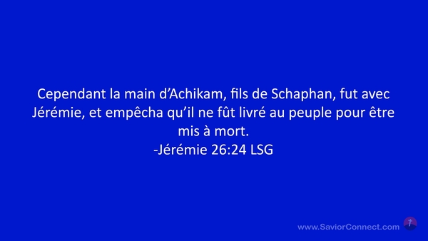 Cependant la main d'Achikam, fils de Schaphan, fut avec Jérémie, et empêcha qu'il ne fût livré au peuple pour être mis à mort. -Jérémie 26:24 LSG