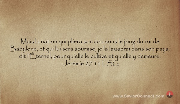 Mais la nation qui pliera son cou sous le joug du roi de Babylone, et qui lui sera soumise, je la laisserai dans son pays, dit l'Éternel, pour qu'elle le cultive et qu'elle y demeure. -Jérémie 27:11 LSG