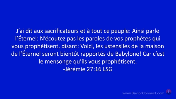 J'ai dit aux sacrificateurs et à tout ce peuple: Ainsi parle l'Éternel: N'écoutez pas les paroles de vos prophètes qui vous prophétisent, disant: Voici, les ustensiles de la maison de l'Éternel seront bientôt rapportés de Babylone! Car c'est le mensonge qu'ils vous prophétisent. -Jérémie 27:16 LSG