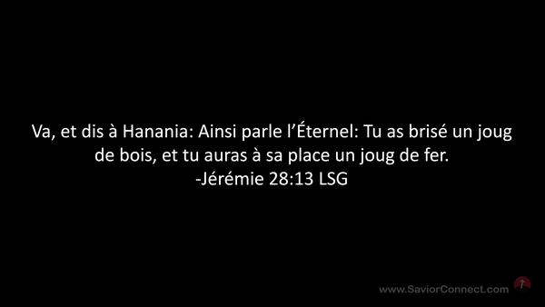 Va, et dis à Hanania: Ainsi parle l'Éternel: Tu as brisé un joug de bois, et tu auras à sa place un joug de fer. -Jérémie 28:13 LSG