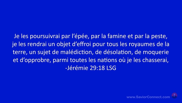 Je les poursuivrai par l'épée, par la famine et par la peste, je les rendrai un objet d'effroi pour tous les royaumes de la terre, un sujet de malédiction, de désolation, de moquerie et d'opprobre, parmi toutes les nations où je les chasserai, -Jérémie 29:18 LSG