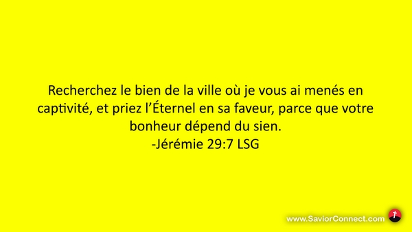 Recherchez le bien de la ville où je vous ai menés en captivité, et priez l'Éternel en sa faveur, parce que votre bonheur dépend du sien. -Jérémie 29:7 LSG
