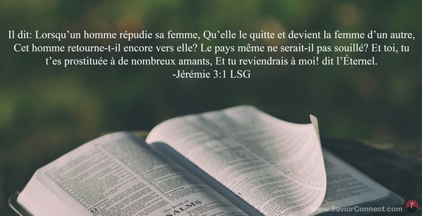 Il dit: Lorsqu'un homme répudie sa femme, Qu'elle le quitte et devient la femme d'un autre, Cet homme retourne-t-il encore vers elle? Le pays même ne serait-il pas souillé? Et toi, tu t'es prostituée à de nombreux amants, Et tu reviendrais à moi! dit l'Éternel. -Jérémie 3:1 LSG