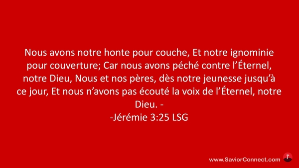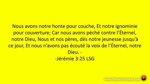 Nous avons notre honte pour couche, Et notre ignominie pour couverture; Car nous avons péché contre l'Éternel, notre Dieu, Nous et nos pères, dès notre jeunesse jusqu'à ce jour, Et nous n'avons pas écouté la voix de l'Éternel, notre Dieu. - -Jérémie 3:25 LSG
