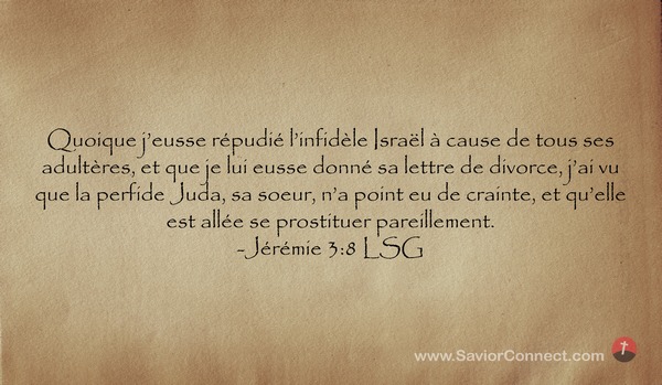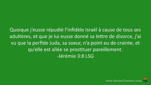 Quoique j'eusse répudié l'infidèle Israël à cause de tous ses adultères, et que je lui eusse donné sa lettre de divorce, j'ai vu que la perfide Juda, sa soeur, n'a point eu de crainte, et qu'elle est allée se prostituer pareillement. -Jérémie 3:8 LSG