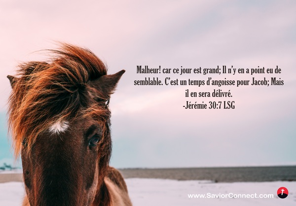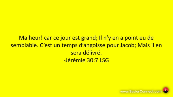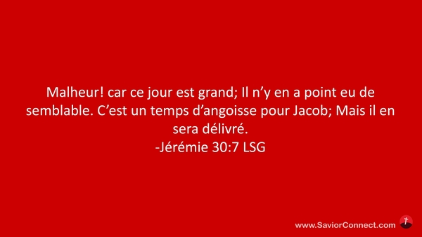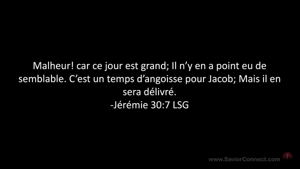 Malheur! car ce jour est grand; Il n'y en a point eu de semblable. C'est un temps d'angoisse pour Jacob; Mais il en sera délivré. -Jérémie 30:7 LSG