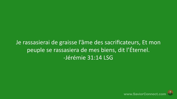 Je rassasierai de graisse l'âme des sacrificateurs, Et mon peuple se rassasiera de mes biens, dit l'Éternel. -Jérémie 31:14 LSG