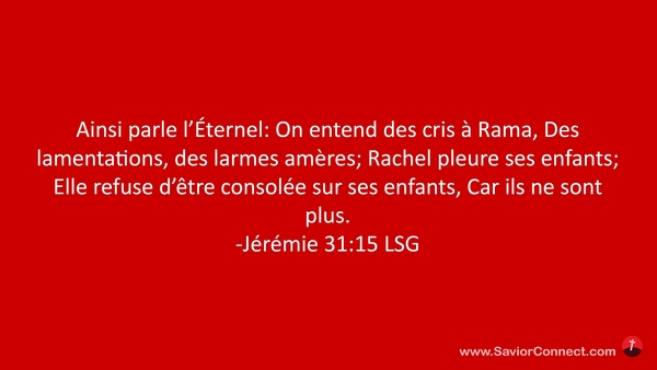 Ainsi parle l'Éternel: On entend des cris à Rama, Des lamentations, des larmes amères; Rachel pleure ses enfants; Elle refuse d'être consolée sur ses enfants, Car ils ne sont plus. -Jérémie 31:15 LSG