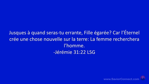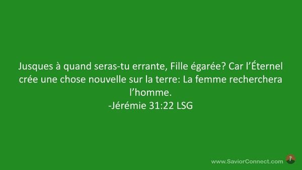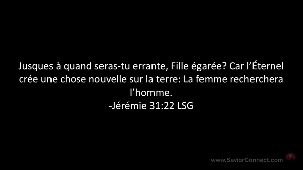 Jusques à quand seras-tu errante, Fille égarée? Car l'Éternel crée une chose nouvelle sur la terre: La femme recherchera l'homme. -Jérémie 31:22 LSG