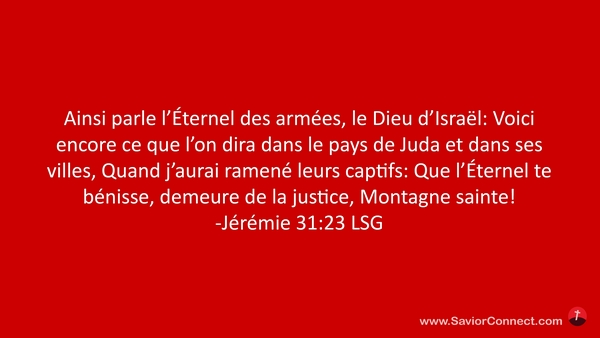 Ainsi parle l'Éternel des armées, le Dieu d'Israël: Voici encore ce que l'on dira dans le pays de Juda et dans ses villes, Quand j'aurai ramené leurs captifs: Que l'Éternel te bénisse, demeure de la justice, Montagne sainte! -Jérémie 31:23 LSG