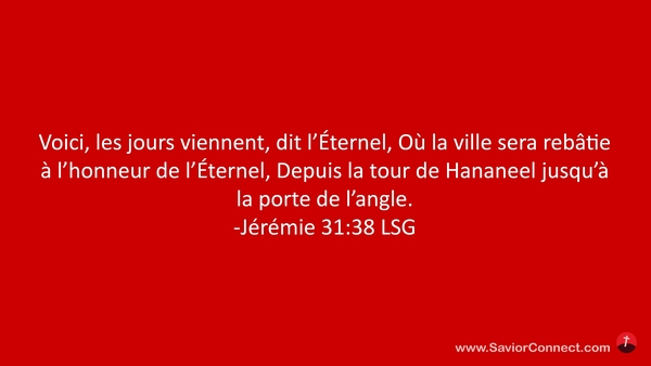 Voici, les jours viennent, dit l'Éternel, Où la ville sera rebâtie à l'honneur de l'Éternel, Depuis la tour de Hananeel jusqu'à la porte de l'angle. -Jérémie 31:38 LSG