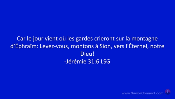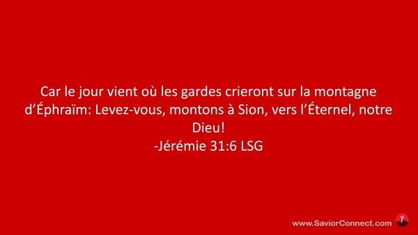Car le jour vient où les gardes crieront sur la montagne d'Éphraïm: Levez-vous, montons à Sion, vers l'Éternel, notre Dieu! -Jérémie 31:6 LSG