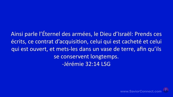 Ainsi parle l'Éternel des armées, le Dieu d'Israël: Prends ces écrits, ce contrat d'acquisition, celui qui est cacheté et celui qui est ouvert, et mets-les dans un vase de terre, afin qu'ils se conservent longtemps. -Jérémie 32:14 LSG
