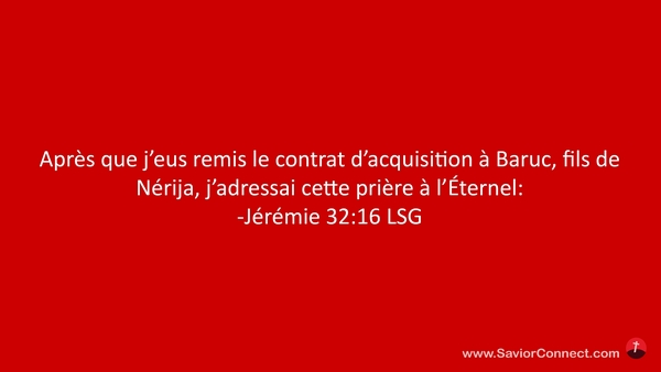 Après que j'eus remis le contrat d'acquisition à Baruc, fils de Nérija, j'adressai cette prière à l'Éternel: -Jérémie 32:16 LSG