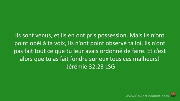 Ils sont venus, et ils en ont pris possession. Mais ils n'ont point obéi à ta voix, Ils n'ont point observé ta loi, Ils n'ont pas fait tout ce que tu leur avais ordonné de faire. Et c'est alors que tu as fait fondre sur eux tous ces malheurs! -Jérémie 32:23 LSG