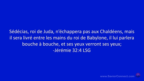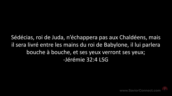 Sédécias, roi de Juda, n'échappera pas aux Chaldéens, mais il sera livré entre les mains du roi de Babylone, il lui parlera bouche à bouche, et ses yeux verront ses yeux; -Jérémie 32:4 LSG