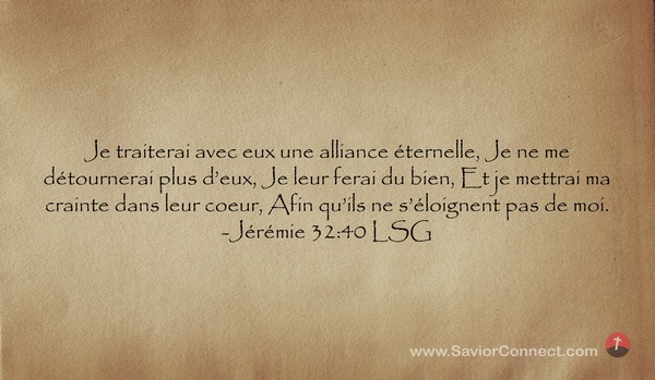 Je traiterai avec eux une alliance éternelle, Je ne me détournerai plus d'eux, Je leur ferai du bien, Et je mettrai ma crainte dans leur coeur, Afin qu'ils ne s'éloignent pas de moi. -Jérémie 32:40 LSG