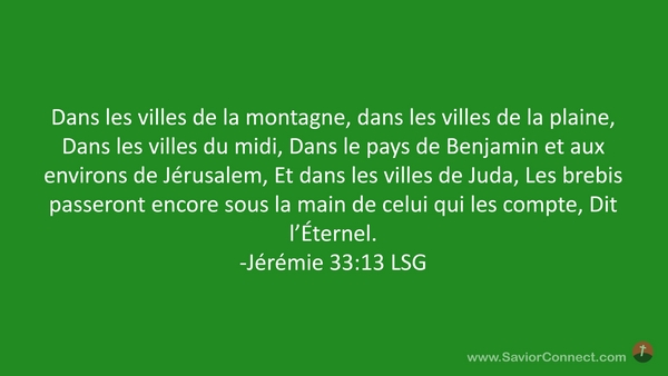 Dans les villes de la montagne, dans les villes de la plaine, Dans les villes du midi, Dans le pays de Benjamin et aux environs de Jérusalem, Et dans les villes de Juda, Les brebis passeront encore sous la main de celui qui les compte, Dit l'Éternel. -Jérémie 33:13 LSG