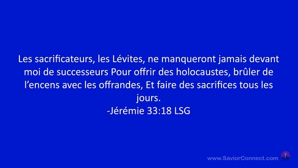Les sacrificateurs, les Lévites, ne manqueront jamais devant moi de successeurs Pour offrir des holocaustes, brûler de l'encens avec les offrandes, Et faire des sacrifices tous les jours. -Jérémie 33:18 LSG
