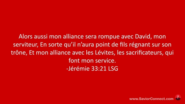 Alors aussi mon alliance sera rompue avec David, mon serviteur, En sorte qu'il n'aura point de fils régnant sur son trône, Et mon alliance avec les Lévites, les sacrificateurs, qui font mon service. -Jérémie 33:21 LSG