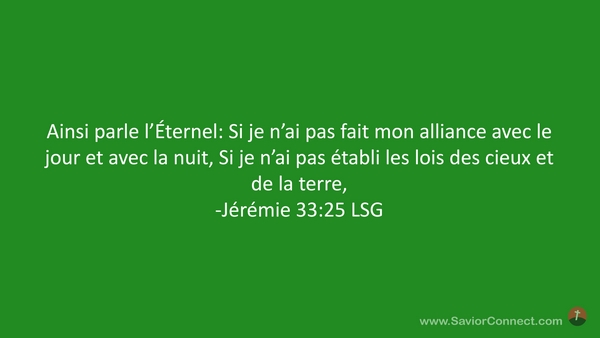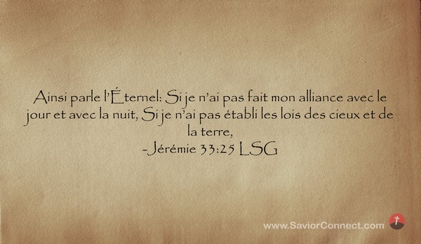 Ainsi parle l'Éternel: Si je n'ai pas fait mon alliance avec le jour et avec la nuit, Si je n'ai pas établi les lois des cieux et de la terre, -Jérémie 33:25 LSG