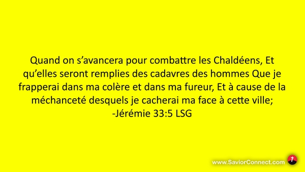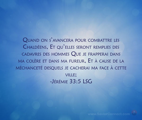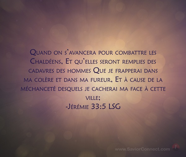 Quand on s'avancera pour combattre les Chaldéens, Et qu'elles seront remplies des cadavres des hommes Que je frapperai dans ma colère et dans ma fureur, Et à cause de la méchanceté desquels je cacherai ma face à cette ville; -Jérémie 33:5 LSG