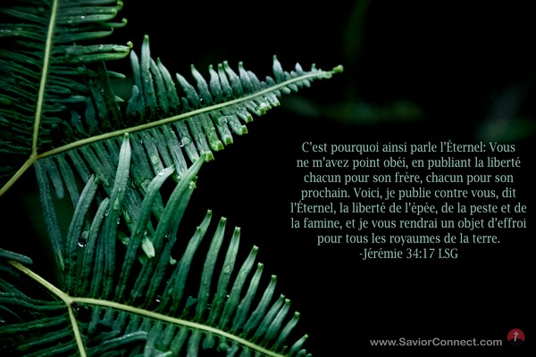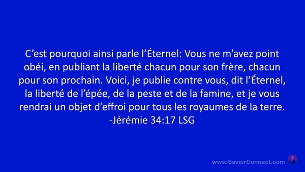 C'est pourquoi ainsi parle l'Éternel: Vous ne m'avez point obéi, en publiant la liberté chacun pour son frère, chacun pour son prochain. Voici, je publie contre vous, dit l'Éternel, la liberté de l'épée, de la peste et de la famine, et je vous rendrai un objet d'effroi pour tous les royaumes de la terre. -Jérémie 34:17 LSG