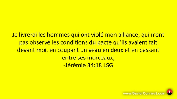 Je livrerai les hommes qui ont violé mon alliance, qui n'ont pas observé les conditions du pacte qu'ils avaient fait devant moi, en coupant un veau en deux et en passant entre ses morceaux; -Jérémie 34:18 LSG