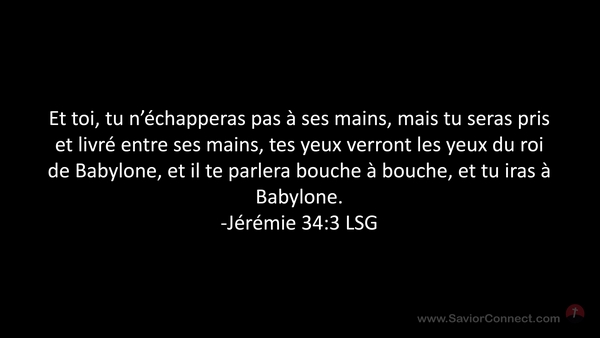 Et toi, tu n'échapperas pas à ses mains, mais tu seras pris et livré entre ses mains, tes yeux verront les yeux du roi de Babylone, et il te parlera bouche à bouche, et tu iras à Babylone. -Jérémie 34:3 LSG
