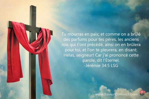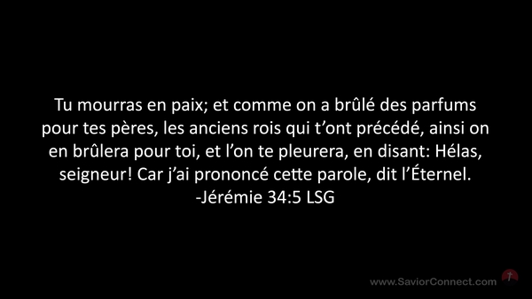 Tu mourras en paix; et comme on a brûlé des parfums pour tes pères, les anciens rois qui t'ont précédé, ainsi on en brûlera pour toi, et l'on te pleurera, en disant: Hélas, seigneur! Car j'ai prononcé cette parole, dit l'Éternel. -Jérémie 34:5 LSG