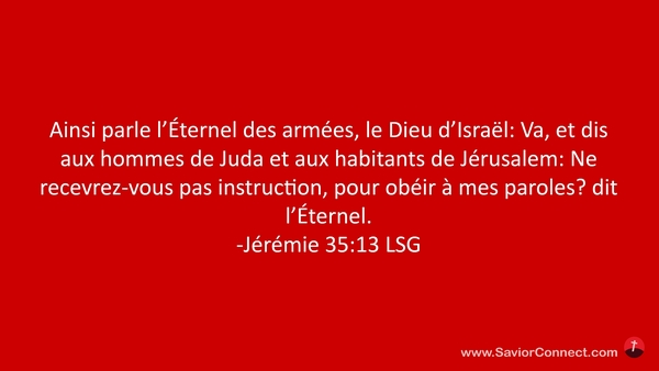 Ainsi parle l'Éternel des armées, le Dieu d'Israël: Va, et dis aux hommes de Juda et aux habitants de Jérusalem: Ne recevrez-vous pas instruction, pour obéir à mes paroles? dit l'Éternel. -Jérémie 35:13 LSG