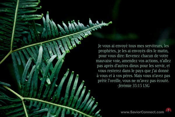 Je vous ai envoyé tous mes serviteurs, les prophètes, je les ai envoyés dès le matin, pour vous dire: Revenez chacun de votre mauvaise voie, amendez vos actions, n'allez pas après d'autres dieux pour les servir, et vous resterez dans le pays que j'ai donné à vous et à vos pères. Mais vous n'avez pas prêté l'oreille, vous ne m'avez pas écouté. -Jérémie 35:15 LSG