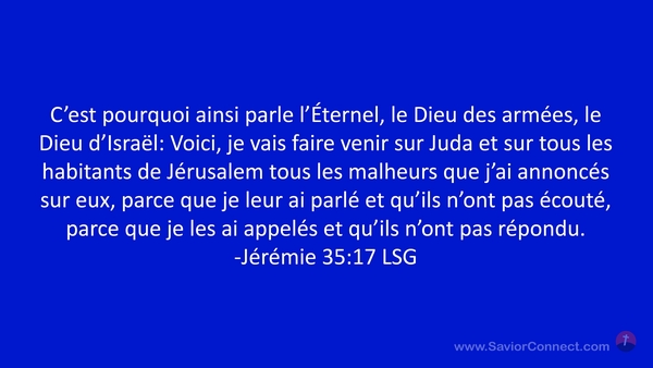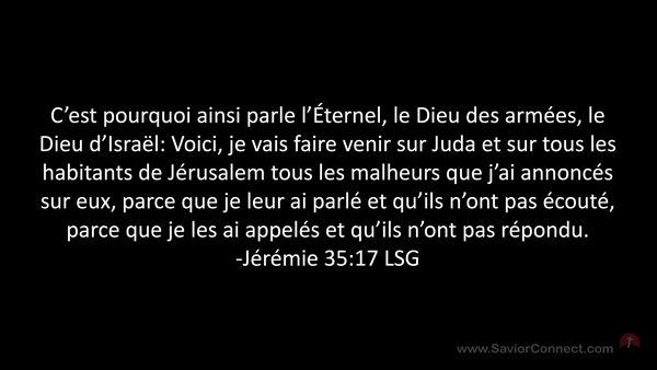C'est pourquoi ainsi parle l'Éternel, le Dieu des armées, le Dieu d'Israël: Voici, je vais faire venir sur Juda et sur tous les habitants de Jérusalem tous les malheurs que j'ai annoncés sur eux, parce que je leur ai parlé et qu'ils n'ont pas écouté, parce que je les ai appelés et qu'ils n'ont pas répondu. -Jérémie 35:17 LSG