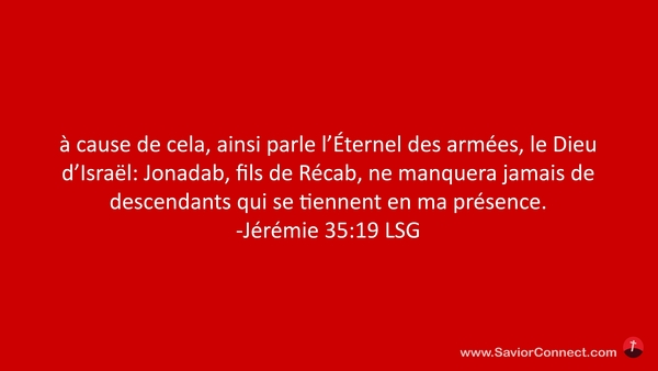 à cause de cela, ainsi parle l'Éternel des armées, le Dieu d'Israël: Jonadab, fils de Récab, ne manquera jamais de descendants qui se tiennent en ma présence. -Jérémie 35:19 LSG