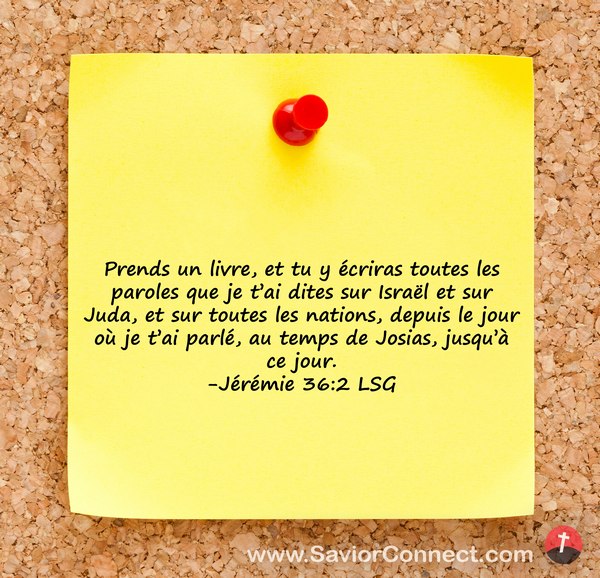 Prends un livre, et tu y écriras toutes les paroles que je t'ai dites sur Israël et sur Juda, et sur toutes les nations, depuis le jour où je t'ai parlé, au temps de Josias, jusqu'à ce jour. -Jérémie 36:2 LSG