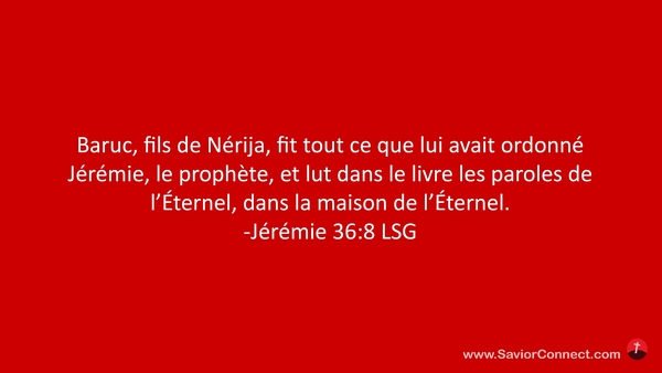 Baruc, fils de Nérija, fit tout ce que lui avait ordonné Jérémie, le prophète, et lut dans le livre les paroles de l'Éternel, dans la maison de l'Éternel. -Jérémie 36:8 LSG