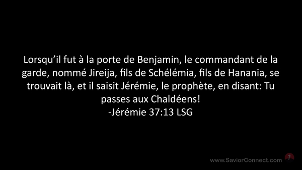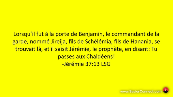 Lorsqu'il fut à la porte de Benjamin, le commandant de la garde, nommé Jireija, fils de Schélémia, fils de Hanania, se trouvait là, et il saisit Jérémie, le prophète, en disant: Tu passes aux Chaldéens! -Jérémie 37:13 LSG