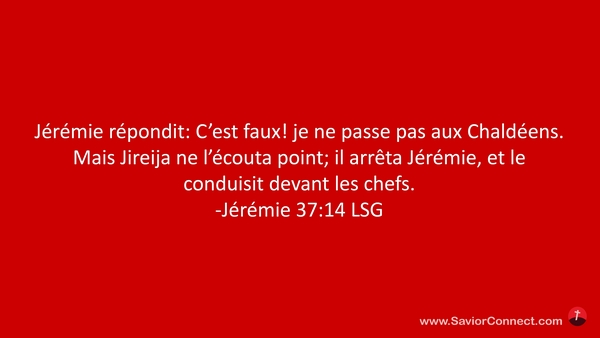 Jérémie répondit: C'est faux! je ne passe pas aux Chaldéens. Mais Jireija ne l'écouta point; il arrêta Jérémie, et le conduisit devant les chefs. -Jérémie 37:14 LSG