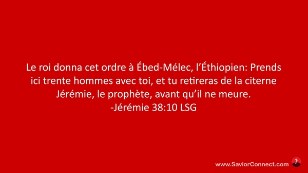Le roi donna cet ordre à Ébed-Mélec, l'Éthiopien: Prends ici trente hommes avec toi, et tu retireras de la citerne Jérémie, le prophète, avant qu'il ne meure. -Jérémie 38:10 LSG