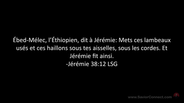 Ébed-Mélec, l'Éthiopien, dit à Jérémie: Mets ces lambeaux usés et ces haillons sous tes aisselles, sous les cordes. Et Jérémie fit ainsi. -Jérémie 38:12 LSG
