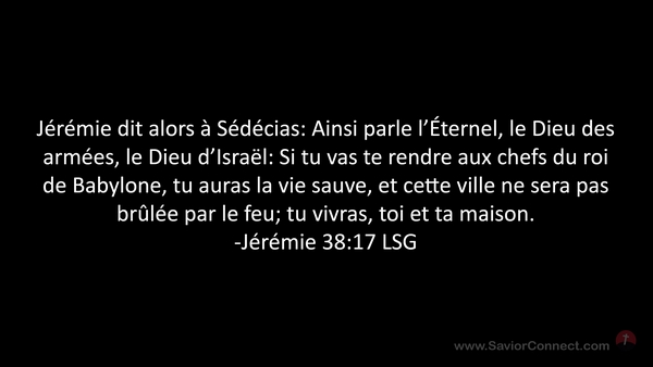 Jérémie dit alors à Sédécias: Ainsi parle l'Éternel, le Dieu des armées, le Dieu d'Israël: Si tu vas te rendre aux chefs du roi de Babylone, tu auras la vie sauve, et cette ville ne sera pas brûlée par le feu; tu vivras, toi et ta maison. -Jérémie 38:17 LSG